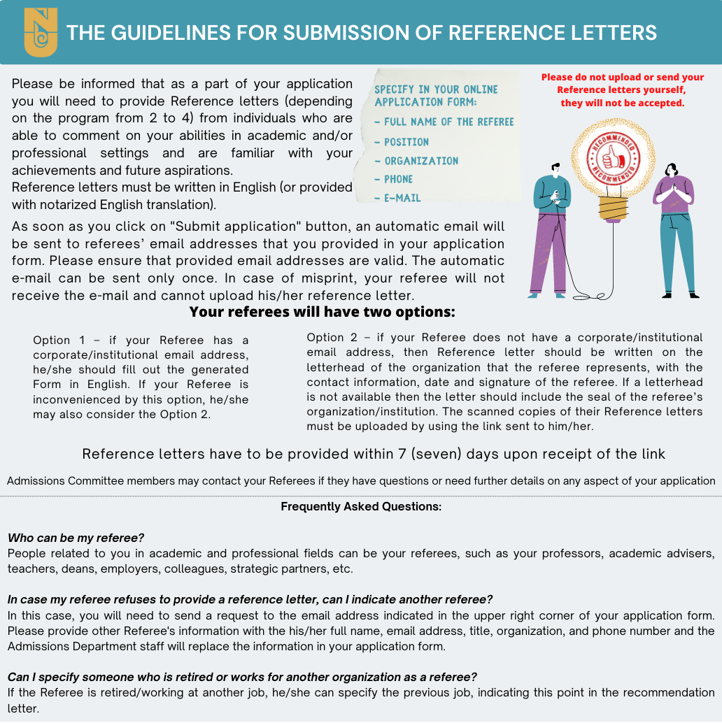 After submission of the online application form, an automatic email notification will be sent to your referees with a request to submit a recommendation letter to NU in accordance with the provided online form. Detailed instruction about providing recommendation letters is available in the personal account.