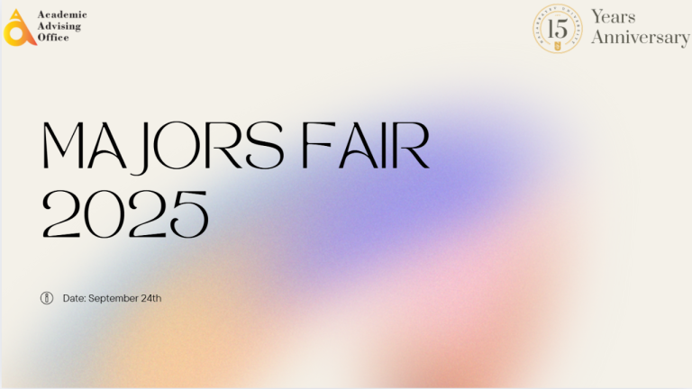 The Academic Advising Office will host the annual Majors Fair on September 24, from 12:00 to 14:00, between Blocks 8 and 9. This event is designed to support NUFYP and first-year undergraduate students in exploring academic opportunities at Nazarbayev University. Representatives from all undergraduate departments will be present to provide detailed information about programs, answer questions, and help students make informed decisions about their future studies.