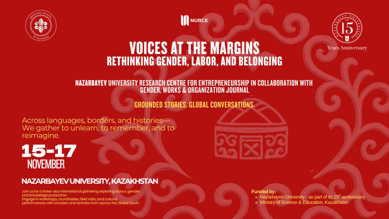 Nazarbayev University’s Research Centre for Entrepreneurship (NURCE) is delighted to announce the international conference “Voices at the Margins: Rethinking Gender, Labor, and Belonging” taking place 15–17 November 2025 at Nazarbayev University, Kazakhstan — in collaboration with the Gender, Work & Organization Journal.