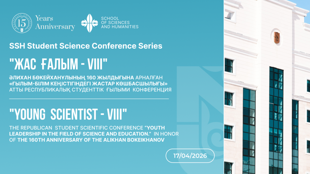 Құрметті NU қауымы! Сіздерді Nazarbayev University Жаратылыстану және гуманитарлық ғылымдар мектебі (NU SSH) ұйымдастыратын дәстүрлі «ЖАС ҒАЛЫМ – VIIІ» республикалық студенттік ғылыми конференциясына шақырамыз Конференция Алаш көшбасшысы Әлихан Бөкейханның 160-жылдық мерейтойы аясында «Ғылым-білім кеңістігіндегі жастар көшбасшылығы» тақырыбында өтеді.Конференция мақсаты: Өтетін күні: 17 сәуір 2026 жылӨтетін уақыты: 09.00-18.00Өтетін орны: NU, Қызыл ...