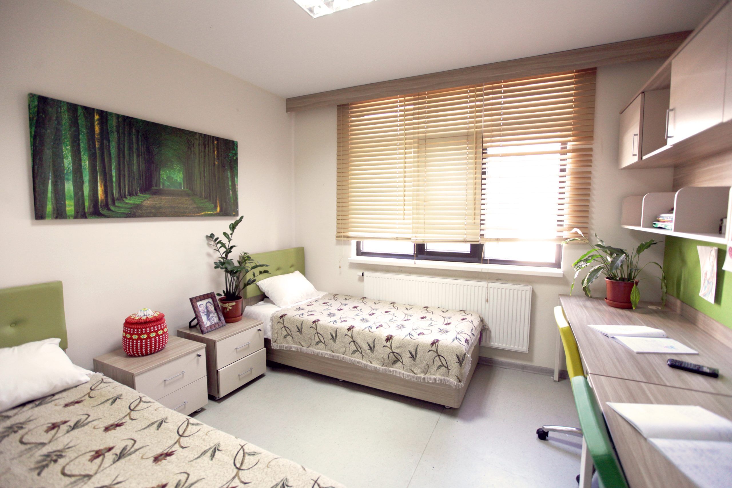 - Бірінші курс студенттері әдетте 3–4 адамдық бөлмелерге орналасады. Кейінгі курстарда студенттер екі адамдық бөлмелерге көшеді.