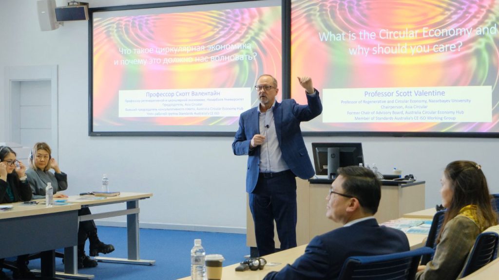 Nazarbayev University’s Graduate School of Public Policy (GSPP) hosted an open lecture by Professor Scott Valentine titled “Circular Economy: Creating a High-Performance Public Sector,” bringing together representatives of public-sector organizations to discuss how circular economy principles can boost productivity, strengthen communities, and support Kazakhstan’s long-term development goals.