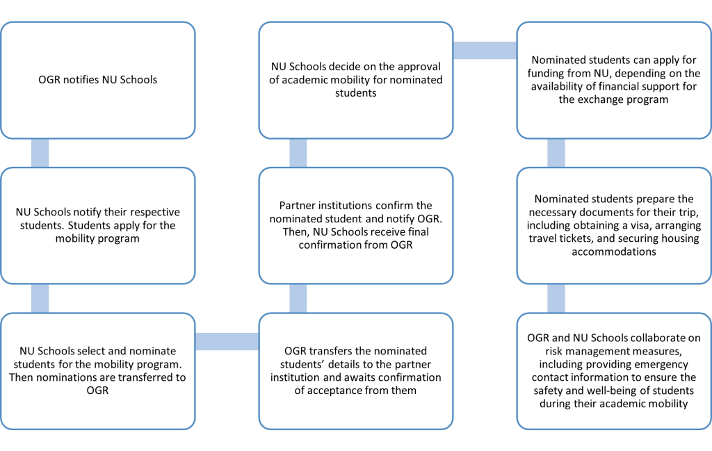 - To complete at least one year (for undergraduate students) / one semester (for Master’s and Ph.D. students) of studies at NU;